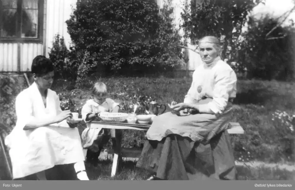Kaffekos i hagen på Kjos, Skiptvet ca. 1927. Datter Olga Hansen f. Skipperud, Oslo, barnebarn Marit Skipperud , kjos og Anette Skipperud f. Saxebøl F.1852 D.1930 - g.m. Martin Skipperud, Kjos. ØFB.1994-00466.