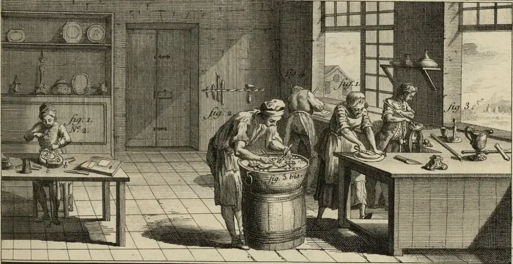Sølvsmeder som arbeider med forgylling i verkstedet. Utsnitt fra Denis Diderot: Encyclopédie. Volume 22. Planches 1, 1762. Bibliothèque Mazarine.