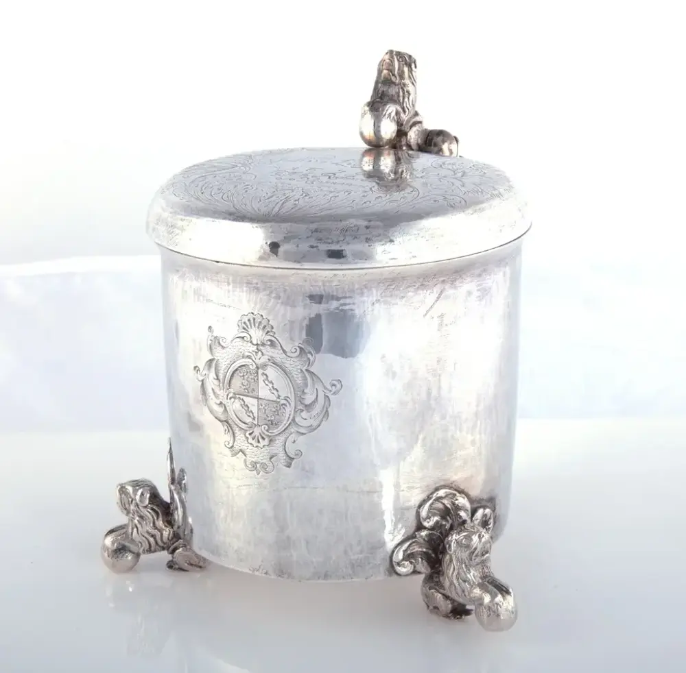 Foto: Morten Reime Aabø / Østfoldmuseene. Et sølvkrus fra 1679 av Christian Thuesen Bæhr, gullsmed i Fredrikstad mellom 1667 og 1690. Kruset er utstilt på Fredrikstad Museum.