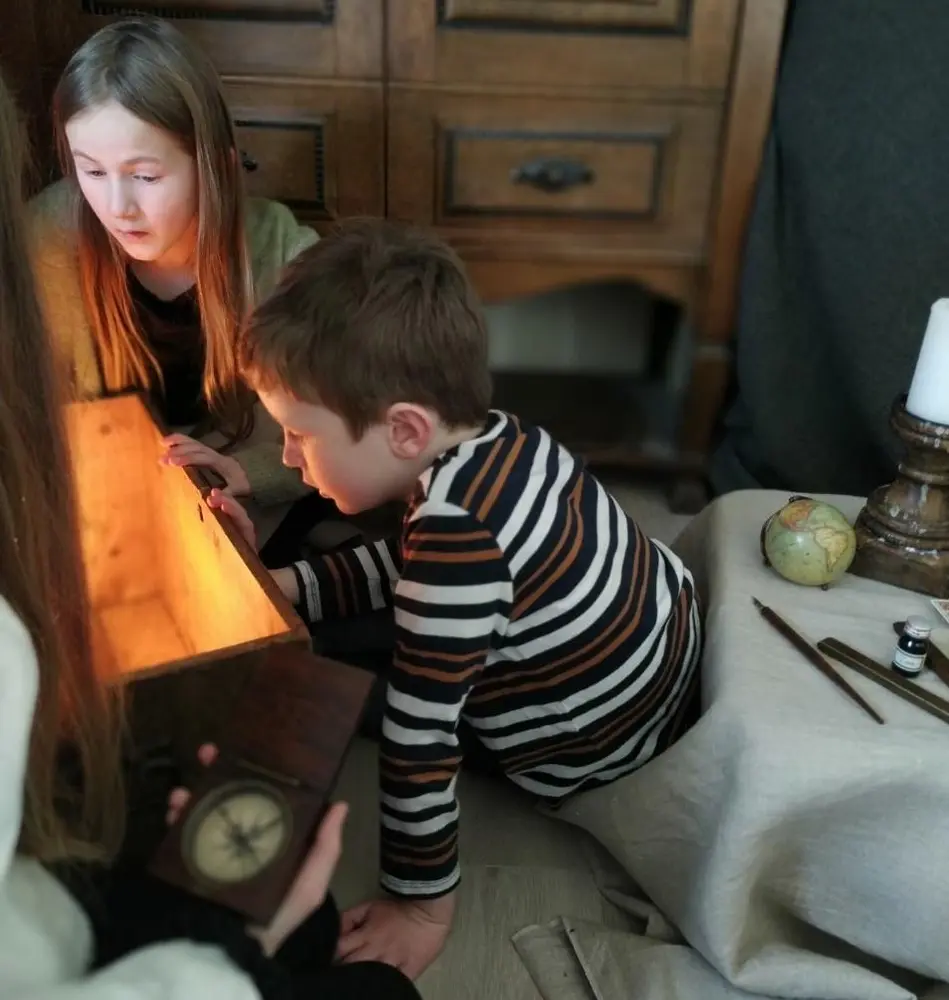 På museet står en gammel kiste - fylt av gåter, gamle kart og hemmeligheter. Hvis du løser oppgavene kan du bli kongens utvalgte kaptein. Vær klar for en ekspedisjon!