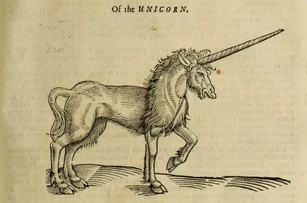Enhjørning: Hentet fra Edward Topsell (1572-625), The history of four-footed beasts and serpents…, London, Printed by E. Cotes, for G. Sawbridge (1658), p. 551. Duke University Libraries,