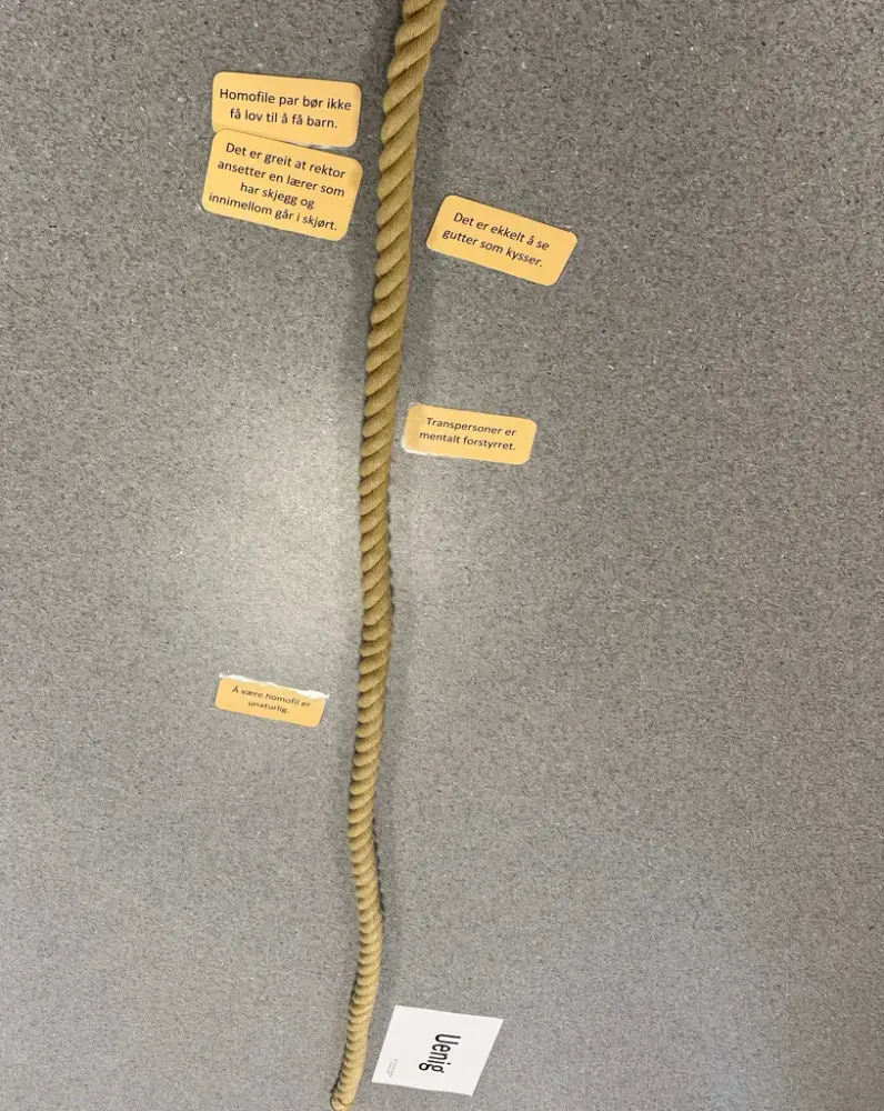 Elevene får opplest påstander og plasserer seg langs et tau der det står «Enig» i den ene enden og «Uenig» i den andre. Ingela Nøding/Østfoldmuseene
