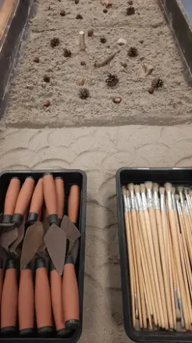 Hun forteller elevene at en arkeolog ikke lager et hull rett nedover i bakken, men fjerner lag på lag med jord over et større område. Dette gjør de både for å øke sjansen for å finne noe og for å forstå hvor gammelt det de eventuelt finner er.
