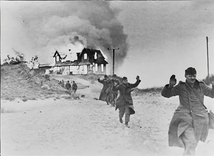 Tyske soldater som overgir seg til "de grønne djevlene". Forsvarets billedarkiv.