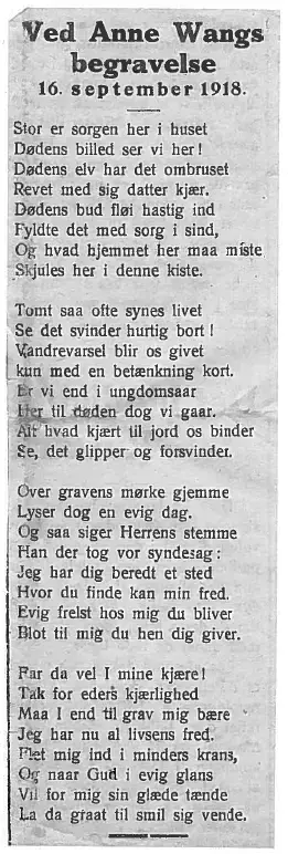 - 1918, i oktober, dør eldste sønn Einar Wang (1891 – 1918), av spanskesyken.