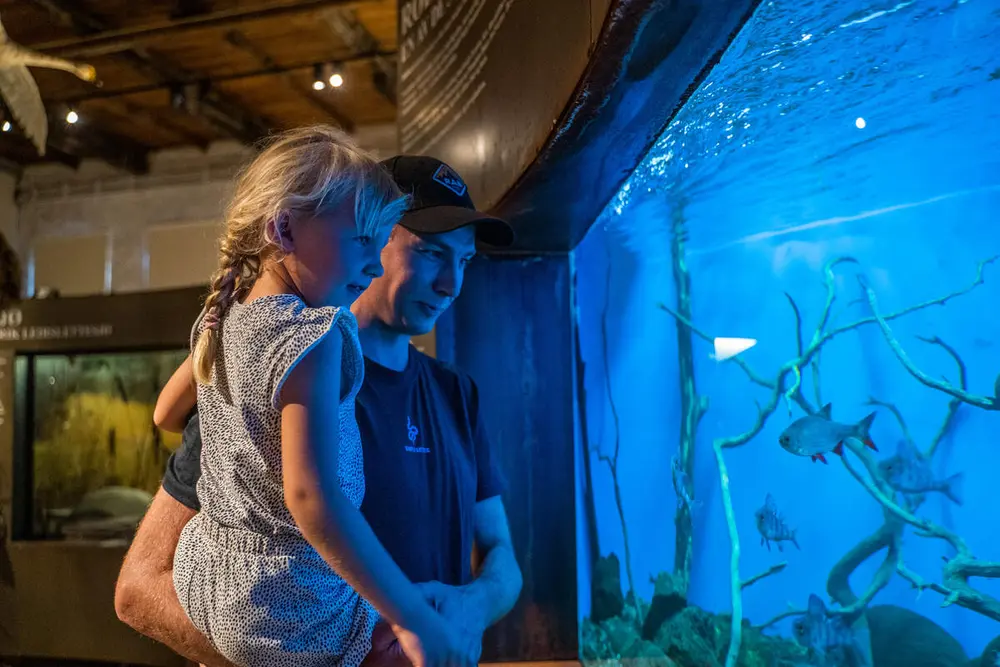 I museets indre sirkel viser isbreen vei inn til den naturhistoriske avdelingen. Isens tilbaketrekning etter siste istid, har hatt stor betydning for hvordan landskapet i Haldenvassdraget ser ut i dag. Da isen smeltet og havnivået sank til lavereliggende områder, ble vassdraget formet med mange innsjøer, elver og våtmarker. Denne geologiske prosessen har formet det rike artsmangfoldet i vassdraget og forklarer tilstedeværelsen av noen sjeldne dyregrupper, de såkalte istidsinnvandrerne. På museet har vi et akvarium hvor du kan se noen av disse istidsinnvandrerne på nært hold, og så har vi også akvarier med fisk, kreps og andre ferskvannsdyr. Skogens fugler og pattedyr finner du også i utstillingen vår og – for de ekstra interesserte – mange av sporene de etterlater seg.