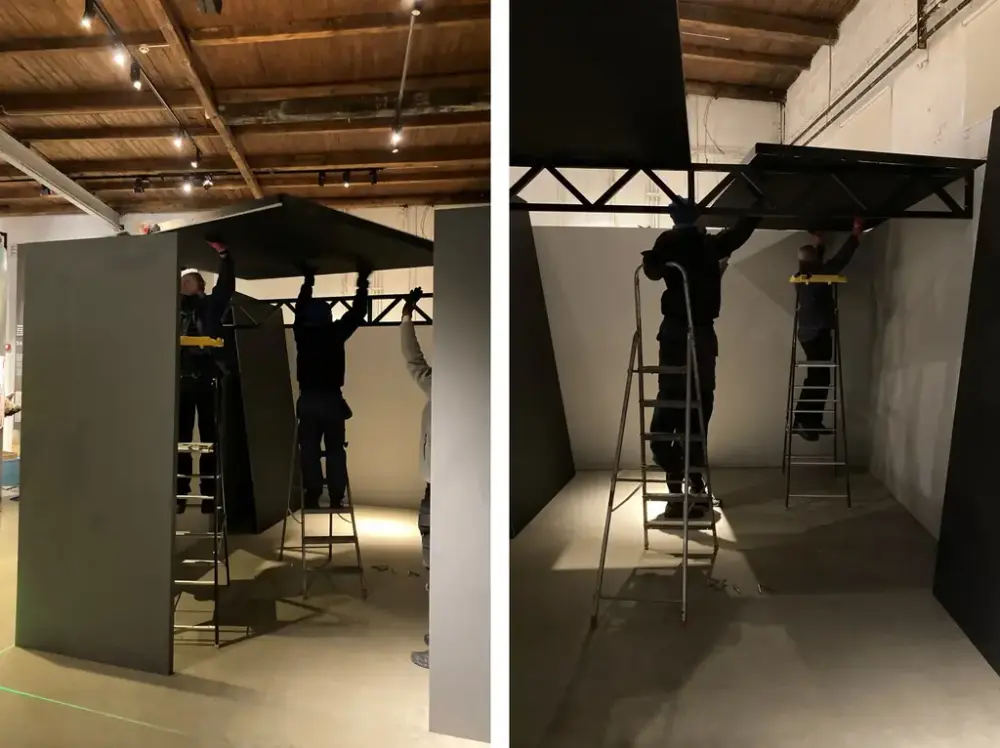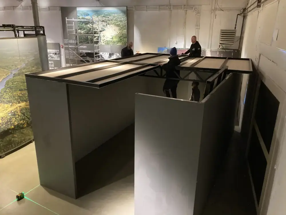 Markus og Andreas fra Måneproduksjoner AS i samarbeid med Østfoldmuseenes Christer og Morten om monteringen av «ulvekapselen» på Kanalmuseet. Catharina Broch/Østfoldmuseene - 2/3