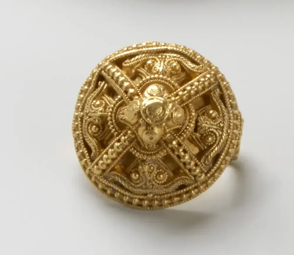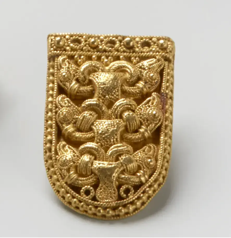 Begge disse gjenstandene utgjør sammen med Gullsporen den store gullskatten fra Rygge. Som Gullsporen er begge disse dekorert med lignende flettearbeid og gullsmedarbeid. På remendebeslaget er det en båndfletting, ser du nøye ser du her hoder i endene. Mystisk, ikke sant? Det ser faktisk ut som fuglehoder med krumt nebb og med store øyne. Wuuæææ!
