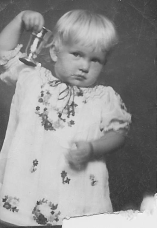 Fotoet viser prisvinneren Ruth Sørnes 2 år gammel i vinnerantrekket med pokalen i sin hånd. Foto: privat.