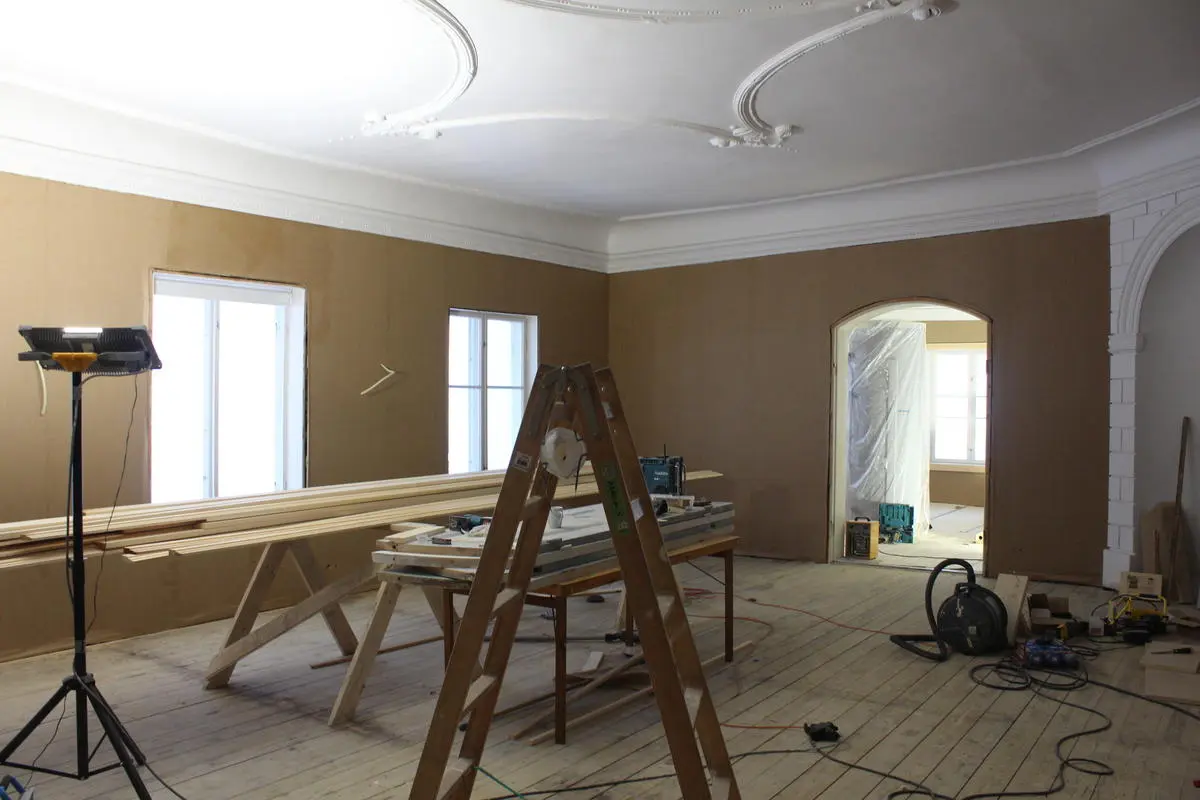 Det er alltid kortere enn vi tror til frister, men arbeidet på Torderød er godt i gang. Tidligere bestod salen i annen etasje av tre rom. Dette rommet er nå tilbakeført til sin opprinnelige utstrekning, og slik at vi får et godt inntrykk av rommet og av rommets tidligere funksjon. Her har også stukkatur fra svunnen tid blitt bragt frem igjen, døråpninger er gjenåpnet og kaminen kommer til sin rette. Det skal også sies at stukkaturen, der den var ødelagt har blitt møysommelig reparert.