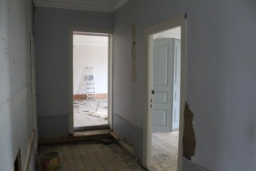 En interessant detalj i dette rommet er en dobbeltdør, som tidligere antagelig betjente hoveddør-funksjonen inn til salen, og den skal nå igjen – etter en remontering og henting fra loftet, stå på sin opprinnelig plass.