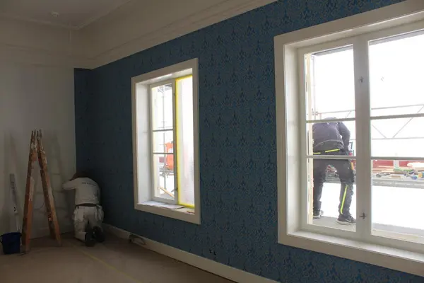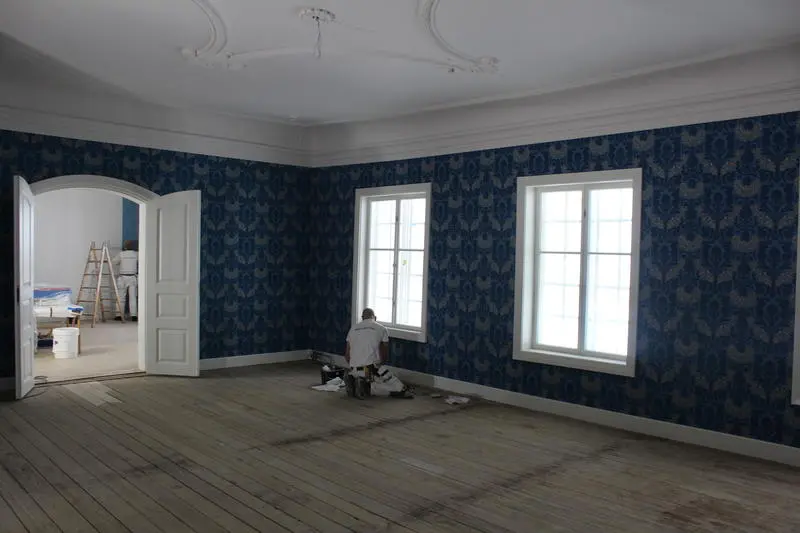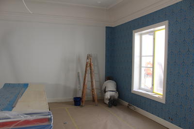 Arbeidet med å tapetsere på Torderød er tidkrevende, og krever både erfaring og presisjon.