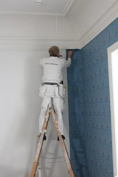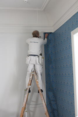 Og for at rommet skal bli helhetlig må hver eneste strimmel med tapet nøye settes sammen slik at mønstrene overlapper hverandre, og det er jammen ikke lett når historiske bygninger både kan være skjeve og ha gjennomgående ulike høyder fra begynnelsen til enden av rommet.