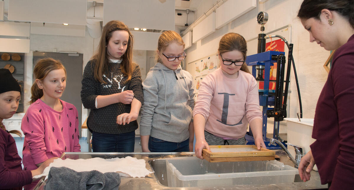 Med en enkel maskinpark kan du lage papirmasse av brukt papir og lage nytt papir ved hjelp av nettingrammer. Papirene får du selvsagt med deg hjem.