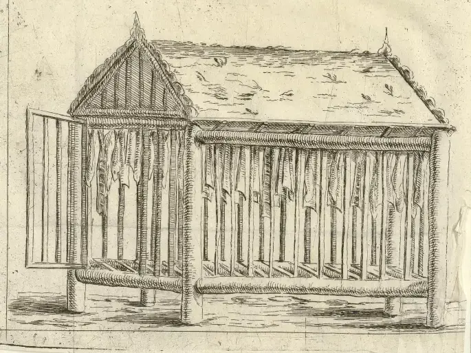 Den italienske presten Francesco Negri reiste gjennom Nordland på vei til Nordkapp i 1664. I hans trykte reiseberetning Viaggio settentrionale, utgitt i 1700, viser et kobberstikk hvordan man tørket fisk i Nord-Norge. Foto: Nasjonalbiblioteket. Nasjonalbiblioteket