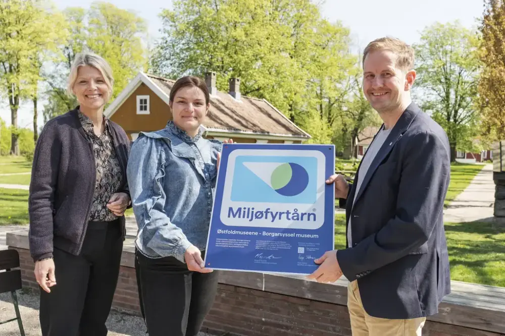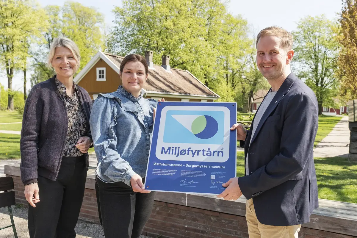 Overrekkelse av Miljøfyrtårnsertifikat på Borgarsyssel 12.05.2025. Fra venstre: Avdelingsdirektør Bjørg Holsvik, Miljøfyrtårnansvarlig Aurora Olea Søbye og Ordfører i Sarpsborg kommune Magnus Arnesen. Fotograf: Øyvind Andersen/Østfoldmuseene.