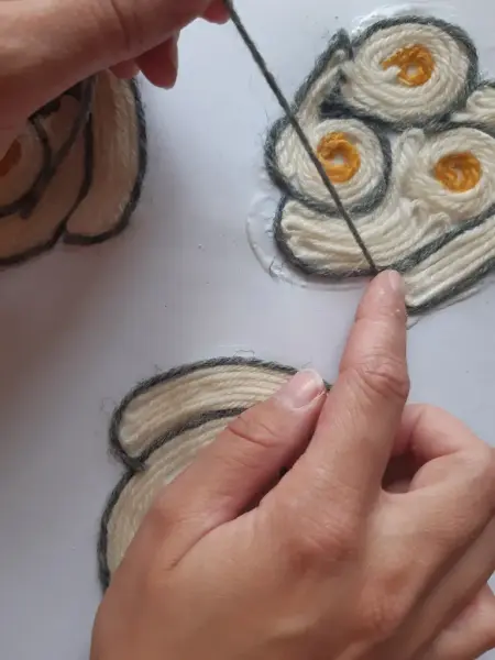 Under høstmarkedet på Rød setter vi opp tekstilverksted på Røds gamle kjøkken og lager bilder med bruk av garn og tekstiler.